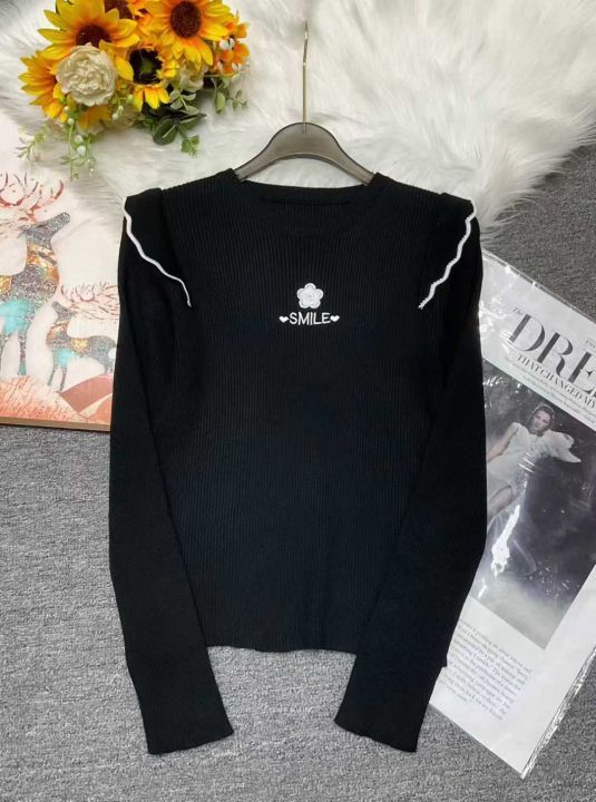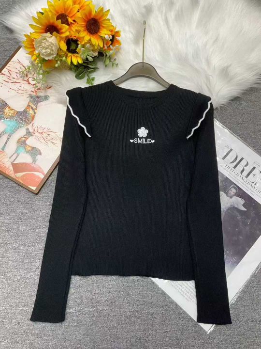秋冬新款复古港味荷叶边弹力修身刺绣套头毛衣,独立包...