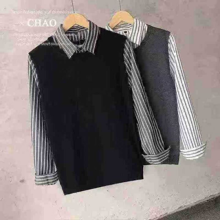 男装马甲毛衣➕衬衫两件套假两件翻领毛衣男套头秋冬季...
