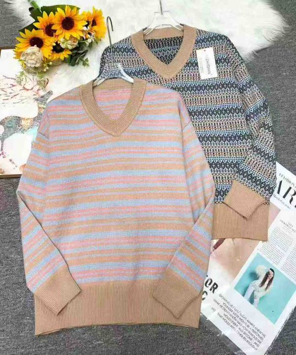 秋冬新款V领提花宽松慵懒风包芯纱套头毛衣,独立包装...