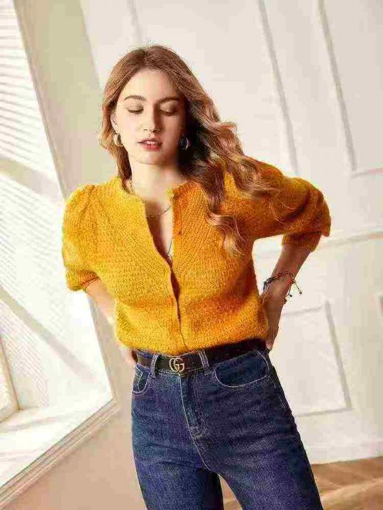 全清12.9,2025新款开衫毛衣女灯笼袖复古贵气质圆领钩花蓬松法式羊毛针织衫,均码34件,独立包装吊牌,不分货