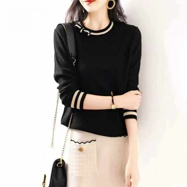 秋季新品小香风蝴蝶结装饰气质宽松显瘦针织圆领套头毛衣,独立包装,均码面...