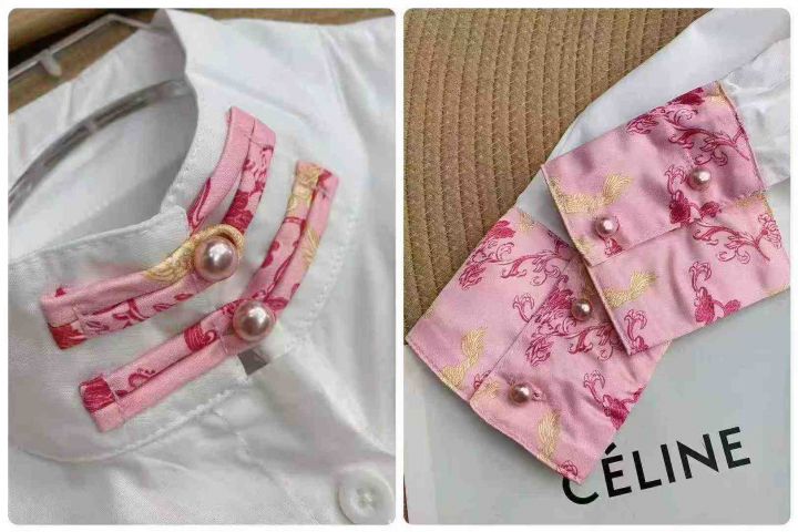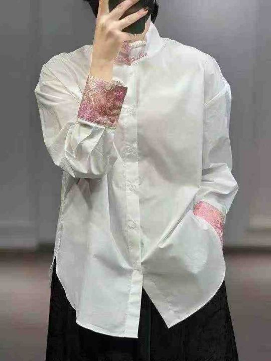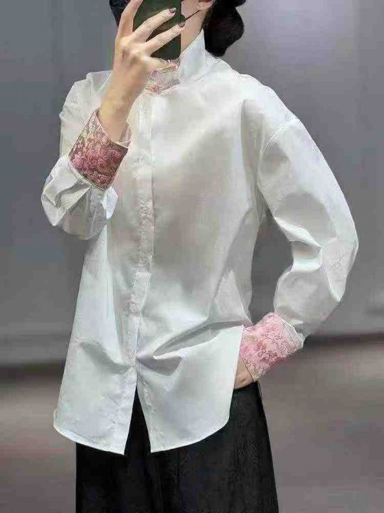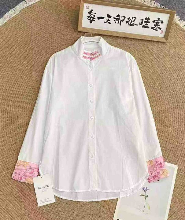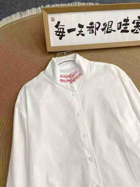 新中式立领衬衫70件11.8,拼接袖口,弧形下摆,珍珠袖...