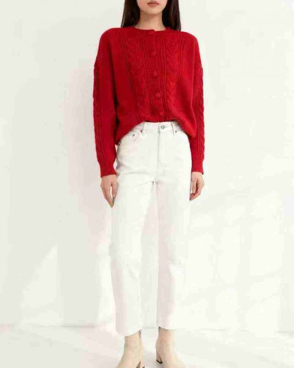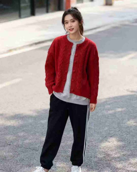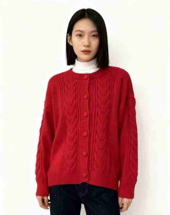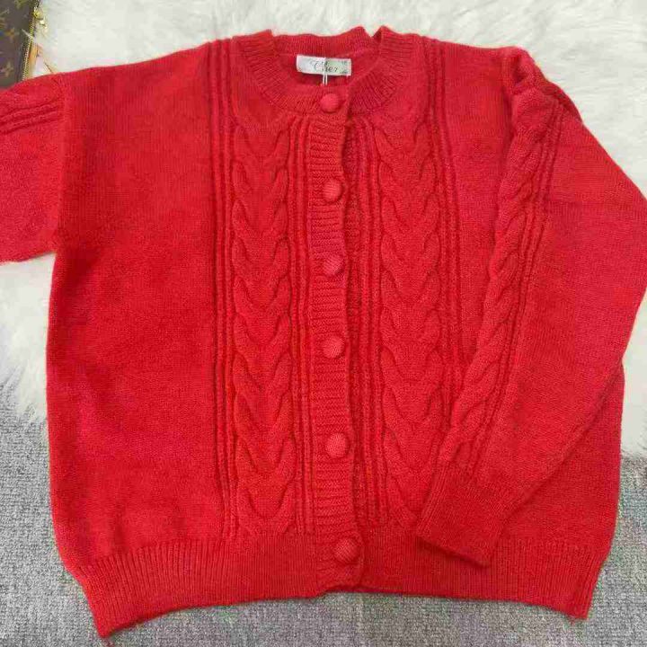 复古圣诞风红色毛衣开衫外套女秋冬加厚短款麻花针织上衣宽松外穿,单款单色,均码16件,不分货。