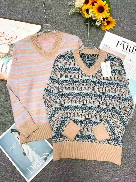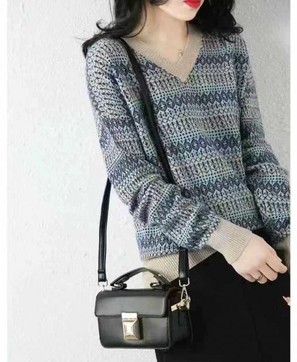 秋冬新款V领提花宽松慵懒风包芯纱套头毛衣,独立包装...