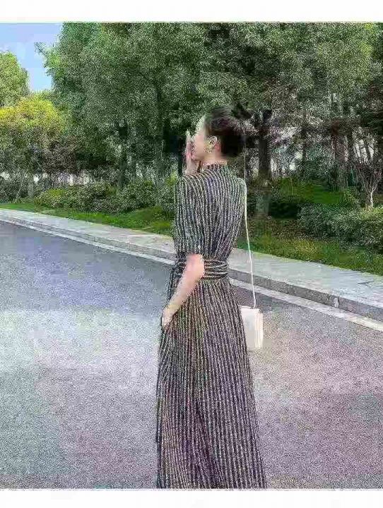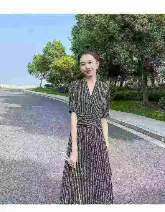 复古法式印花v领显瘦短袖开叉绑带气质长连衣裙,独立包装,码数1-4码,数量382条,1码裙长118厘米,分货加1,(货号0913#44)