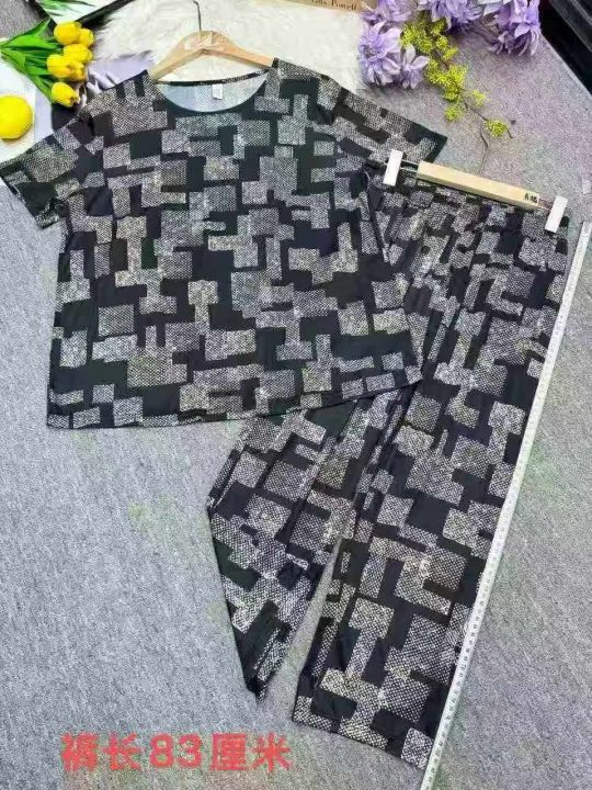妈妈夏装套装冰丝亲肤凉快舒服可外穿中老年人女款上衣五分裤两件套,整款单色,XL裤长82厘米,码数L-3XL,数量222套,(货号0915#53)