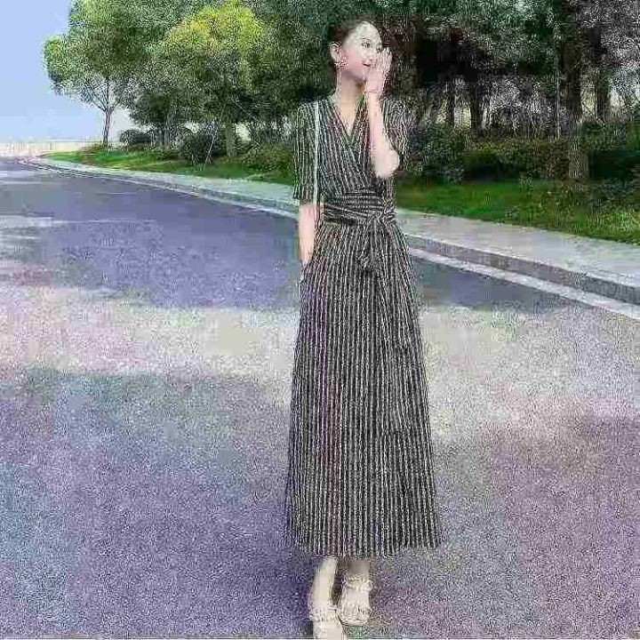 复古法式印花v领显瘦短袖开叉绑带气质长连衣裙,独立包装,码数1-4码,数量382条,1码裙长118厘米,分货加1,(货号0913#44)