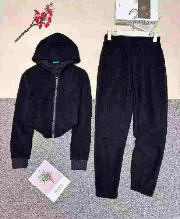 11.5清欧美跨境潮流摇粒绒短款连帽开衫+长裤休闲两件...