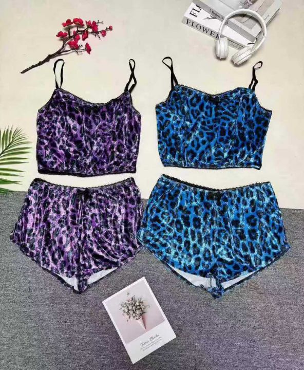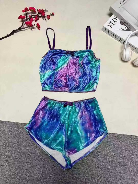 欧美时尚性感金丝绒扎染斑纹吊带短裤两件套,数量1000套左右,码数S-2XL,一个款花型多色,品质好,拉链式独立包装。