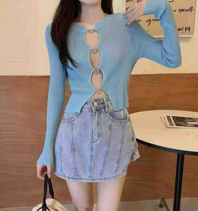 秋季新款美式辣妹镂空长袖弹力修身显瘦性感纯欲针织套...