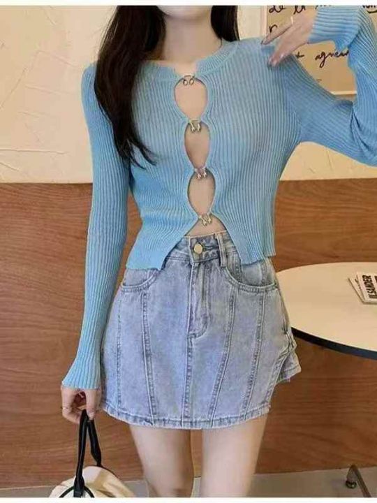 秋季新款美式辣妹镂空长袖弹力修身显瘦性感纯欲针织套...