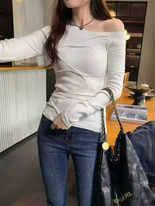 早秋新款纯欲风高级感穿搭气质斜肩长袖包芯纱套头毛衣...