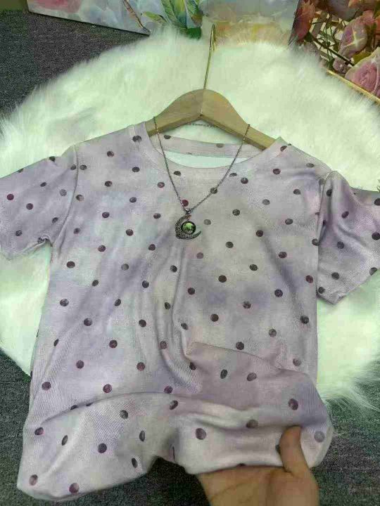 重工晕染波点圆领短袖T恤女夏季设计感显瘦遮肉气质上衣,整款2色,紫色为主,弹力超大,2到5码,3200件左右,4.9秒杀,分货加1