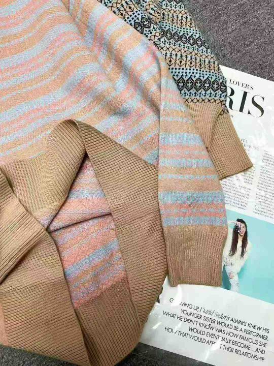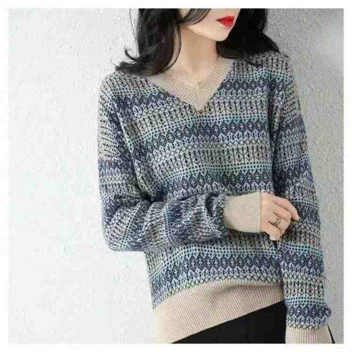 秋冬新款V领提花宽松慵懒风包芯纱套头毛衣,独立包装...