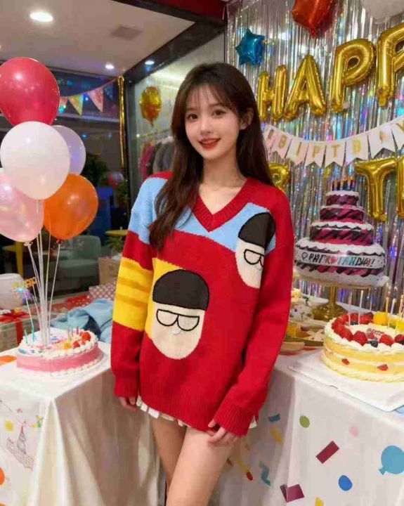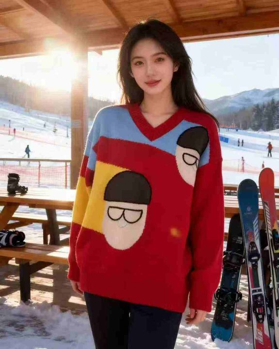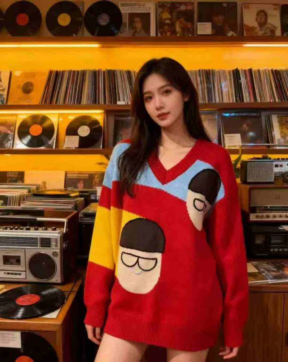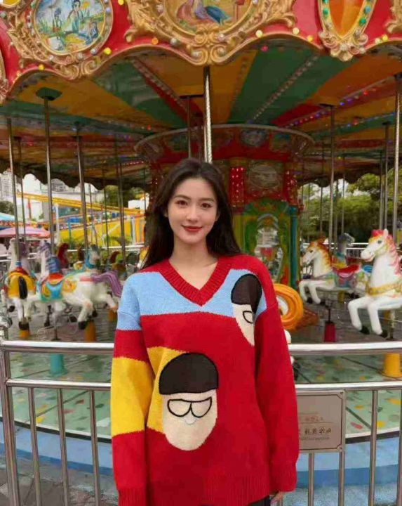 全清11.8,2025早秋款韩系卡通风红色毛衣女宽松V领洋气小众设计感针织衫,单款单色,均码58件,不分货。