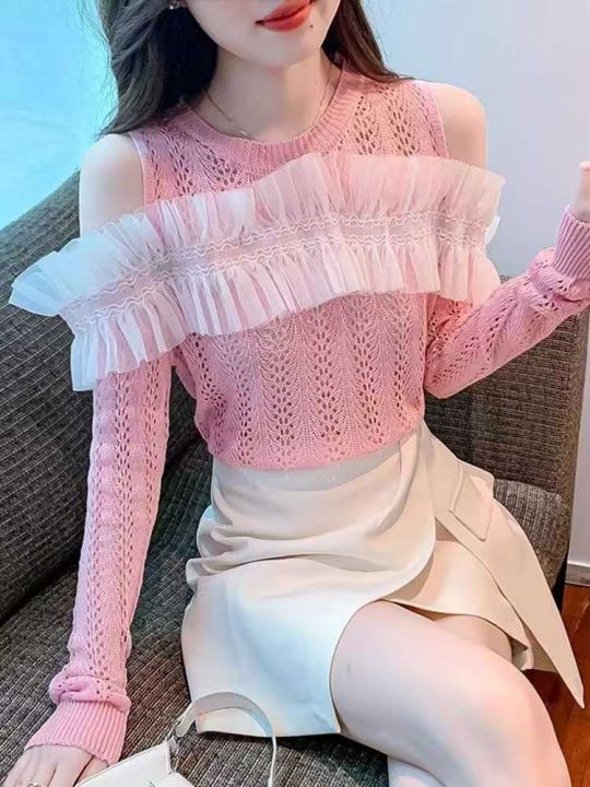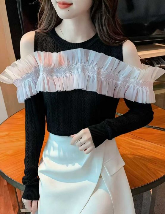秋季新品晓溪同款露肩网纱拼接设计款长袖套头毛衣,独...
