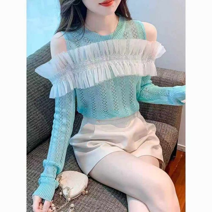 秋季新品晓溪同款露肩网纱拼接设计款长袖套头毛衣,独立包装,均码面料软糯舒适弹力大,110件,全清6.9元超低价秒杀!
