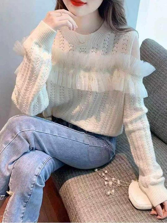 秋季新品晓溪同款露肩网纱拼接设计款长袖套头毛衣,独...