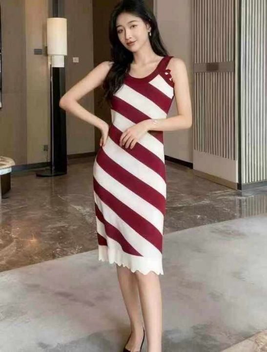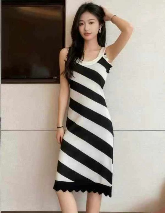 夏季新款法式条纹收腰显瘦针织吊带连衣裙,独立包装,...