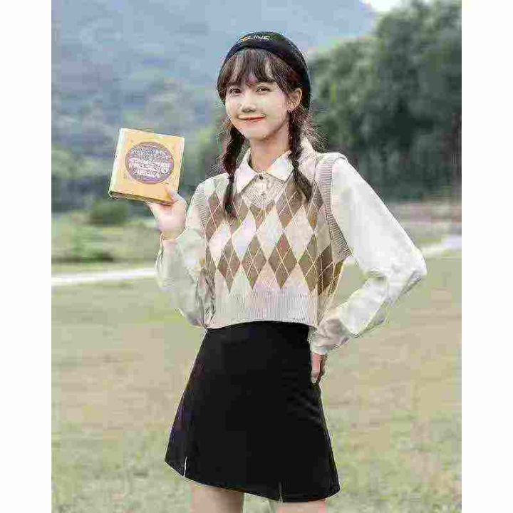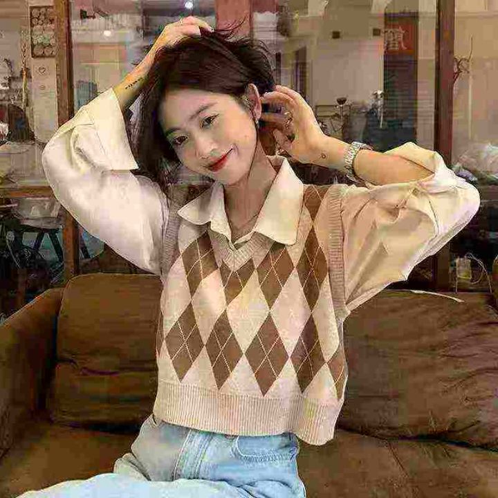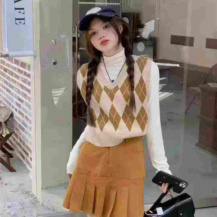 复古咖色菱形格纹马甲女2025春秋新款V领短款针织上衣宽松坎肩外穿潮,独立包装,均码,510件,清5.5,分➕1