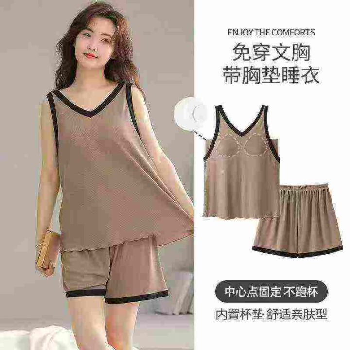 天猫在售款8500件高品质冰丝螺纹纯欲风女士宽松版家居服背心套装,高弹力带胸垫,单款三色,S-3XL,独立包装带吊牌