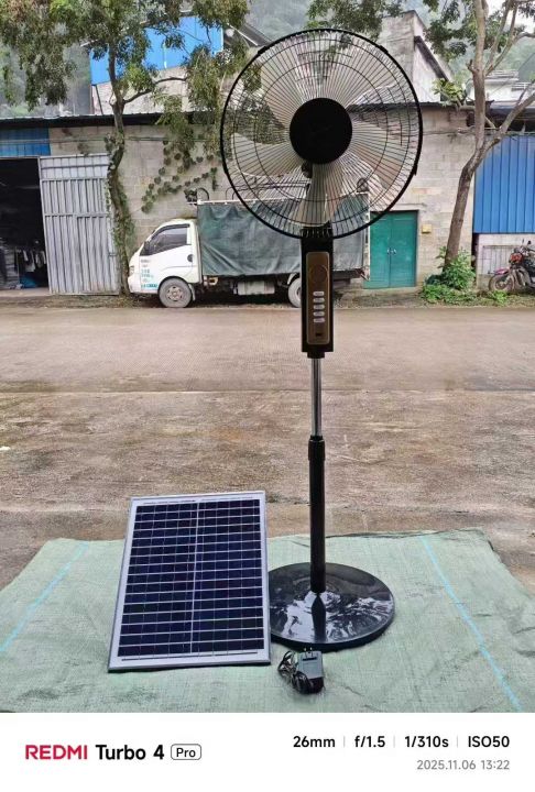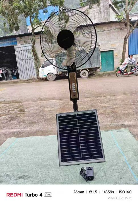 太阳能风扇680台, 12V,18瓦功率,风扇高度115~135厘米(可升降)电源适配器线长1.5米,太阳能板电线长5米,太阳能板尺寸40×35cm,能耗小,风力大,超静音