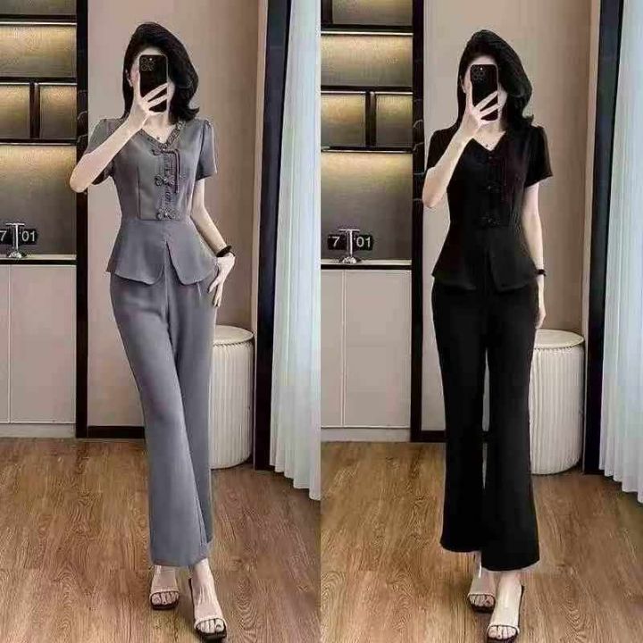 夏季时尚休闲显瘦套装女国风盘扣短袖上衣微喇叭裤两件套,独立包装,货品干...