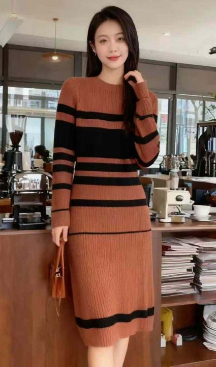 秋冬新款法式复古撞色条纹针织毛衣连衣裙,独立包装,...