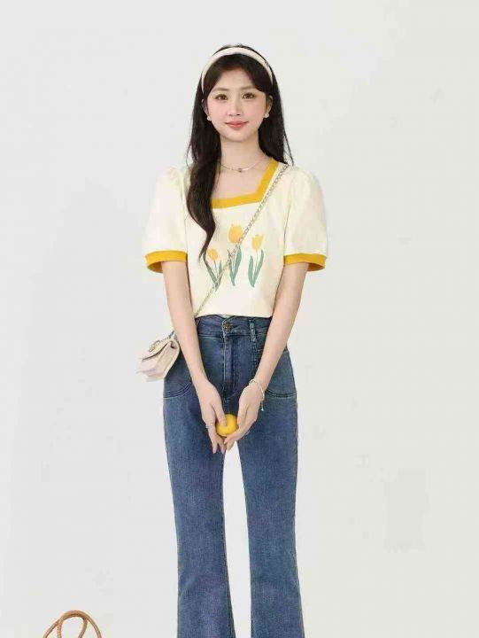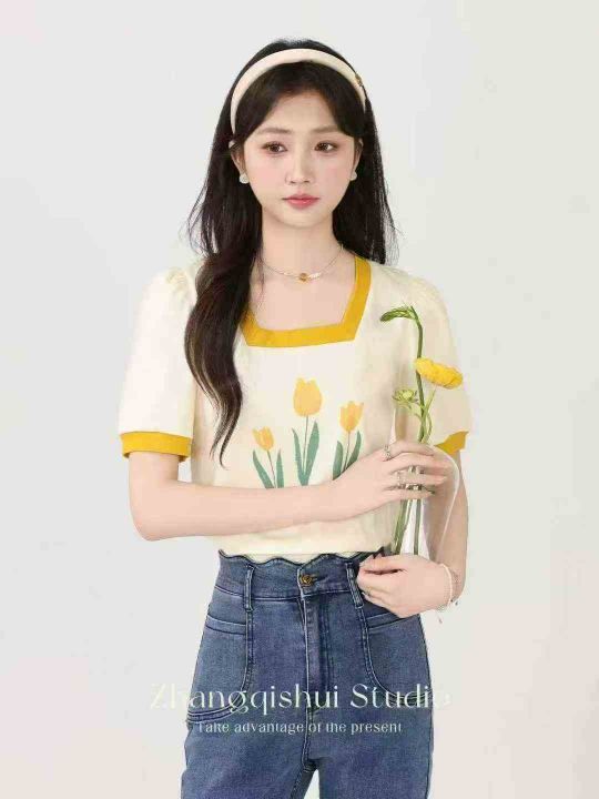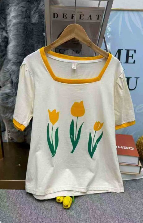 新款别致休闲夏季超火拼接撞色郁金香印花短袖t恤女显瘦短款上衣,独立包装,数量276件,码数1-4(M-2XL),货号1019#45