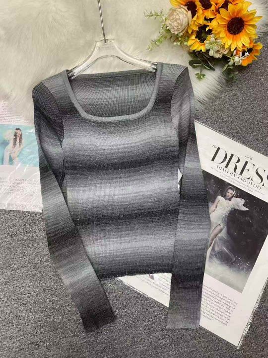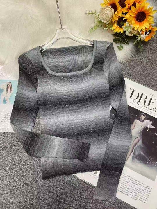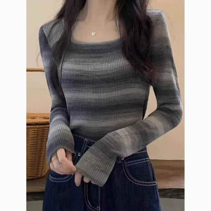 秋冬季新款设计感条纹方领甜辣弹力修身显瘦针织套头毛...