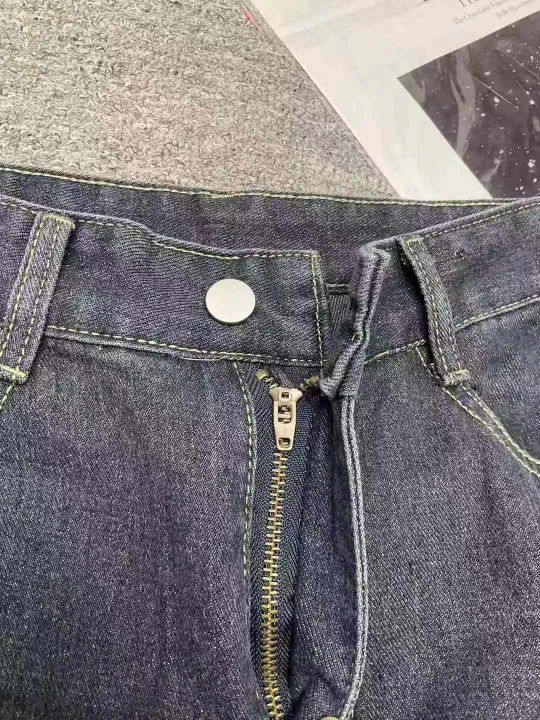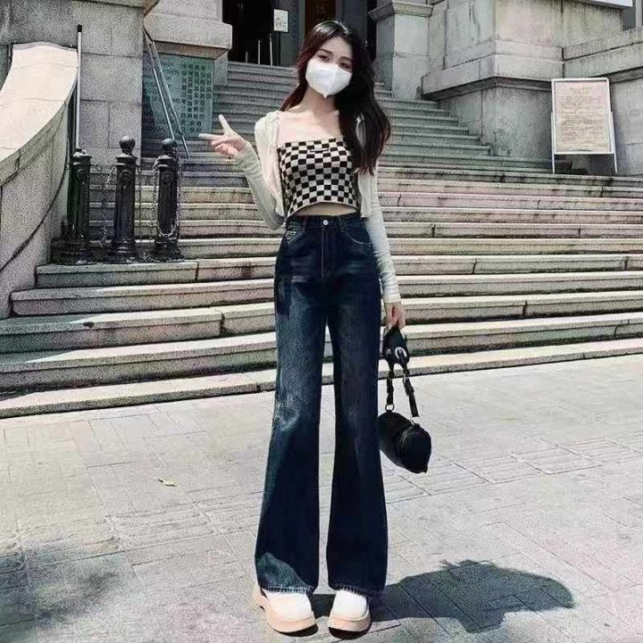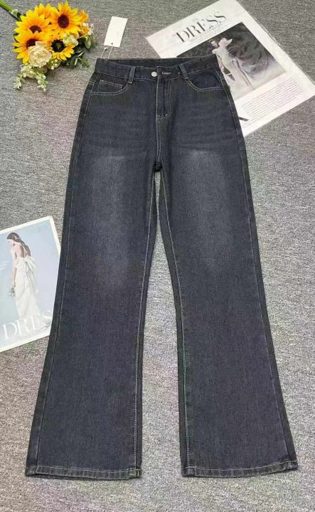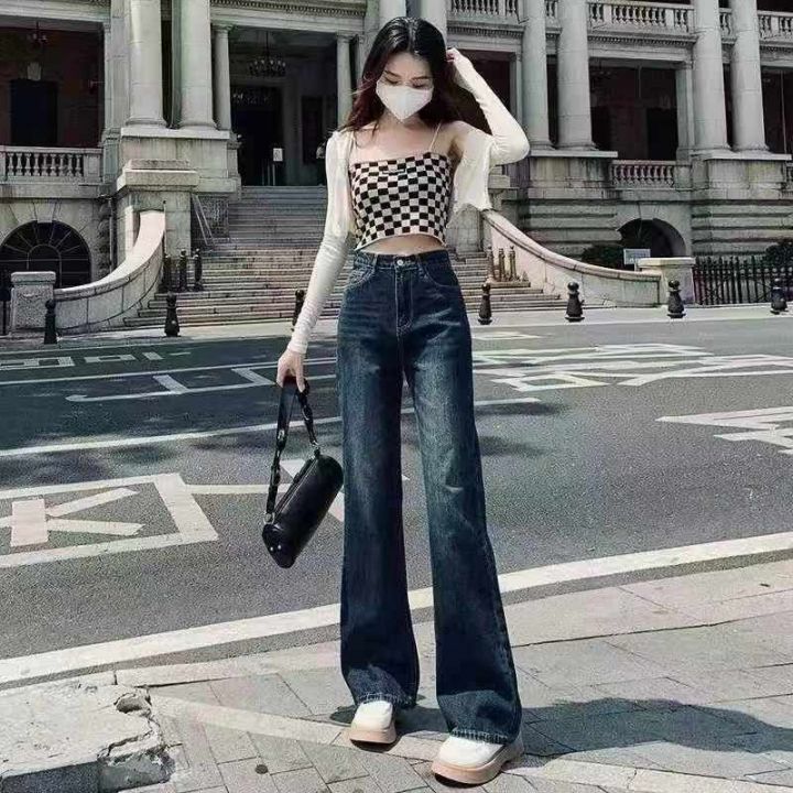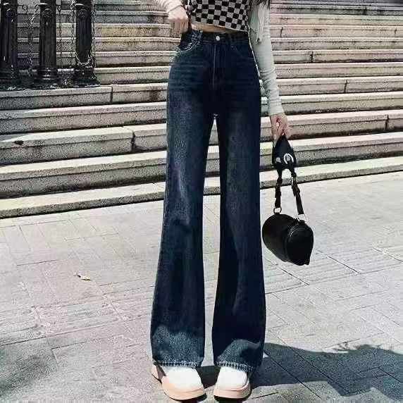秋冬新款洗水棉网红复古蓝直筒阔腿微喇叭牛仔长裤,独...