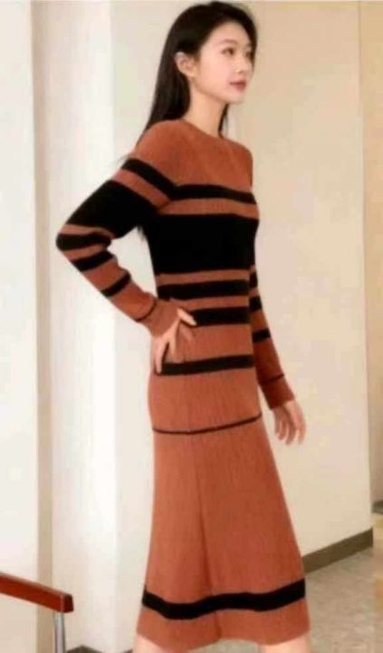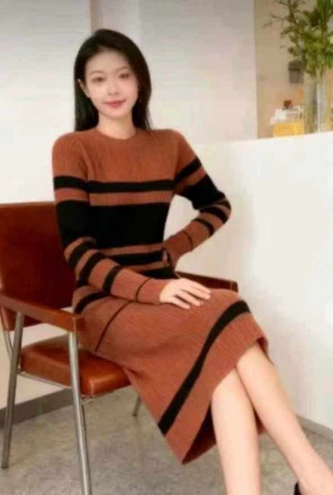 秋冬新款法式复古撞色条纹针织毛衣连衣裙,独立包装,...