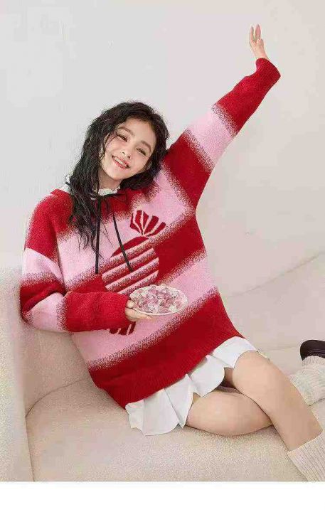 秋冬新款宽松慵懒风乐町草莓奶糖新年红氛围感包芯纱提花钻进套头毛衣,独立包装,均码面料软糯厚实,300件,全清9.9元超低价秒杀!分货加一!