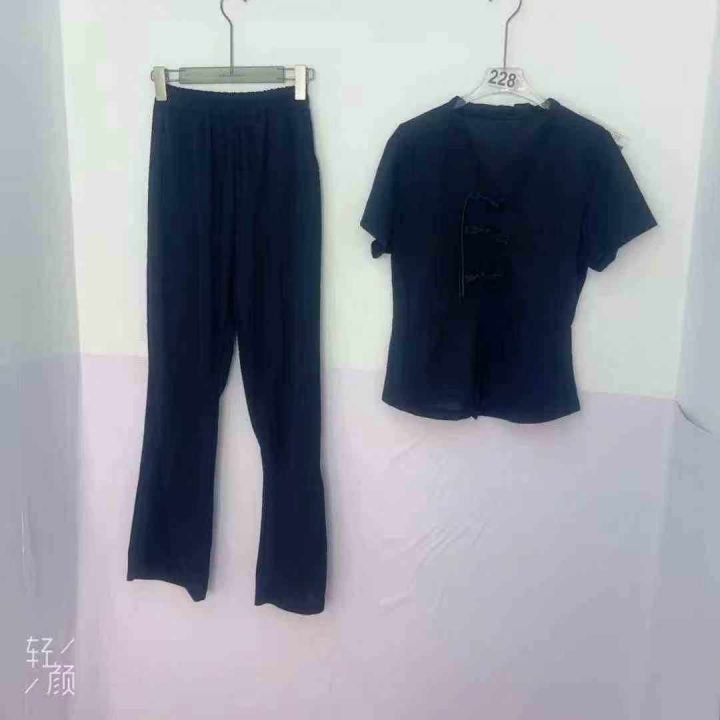 夏季时尚休闲显瘦套装女国风盘扣短袖上衣微喇叭裤两件...