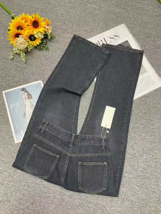 秋冬新款洗水棉网红复古蓝直筒阔腿微喇叭牛仔长裤,独...
