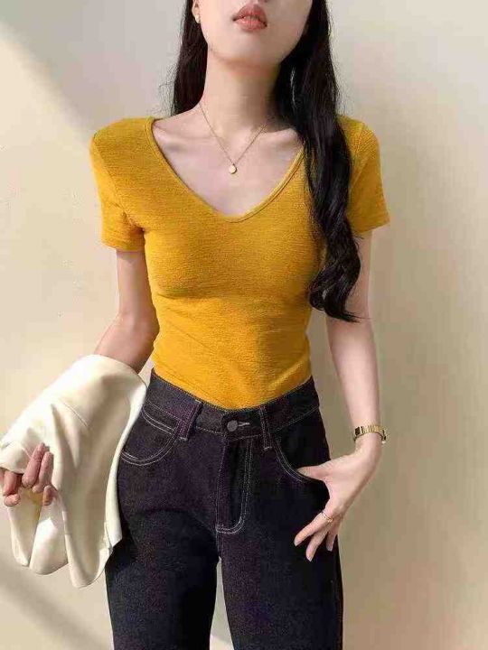 [月亮]:6.5清2240件[月亮]:韩系褶皱肌理感V领正肩T...