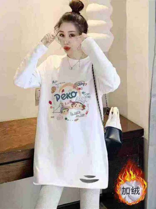 圆领/半高领德绒打底衫女新款内搭宽松白色印花中长款长袖T恤,2种款式,圆...