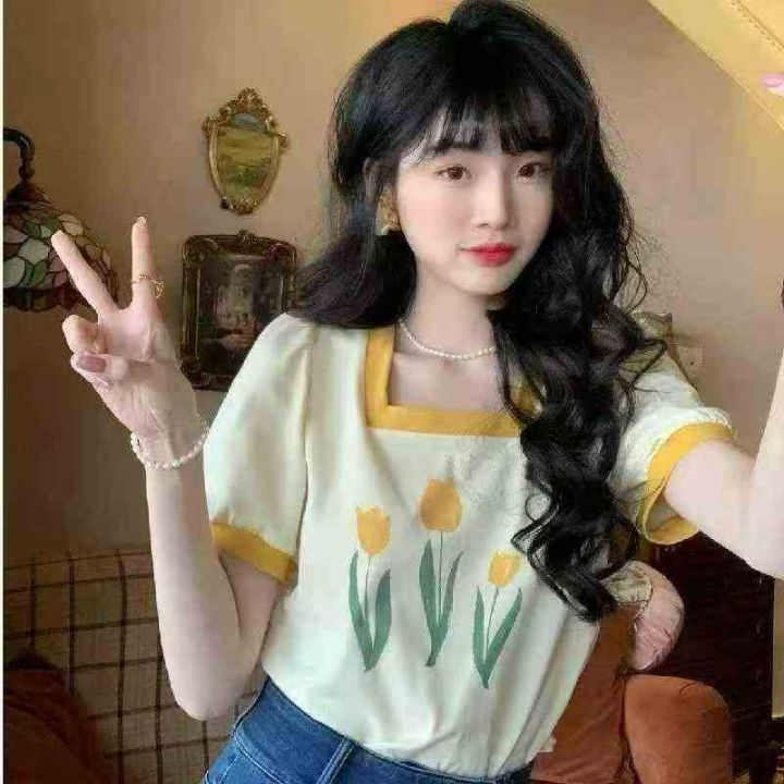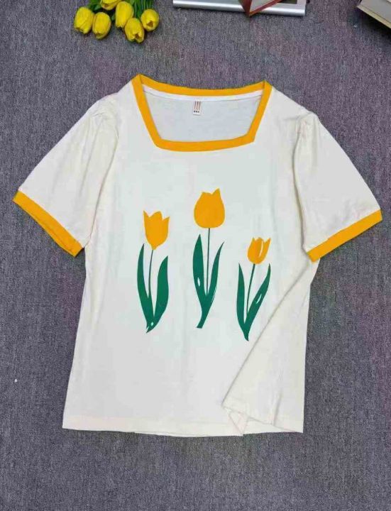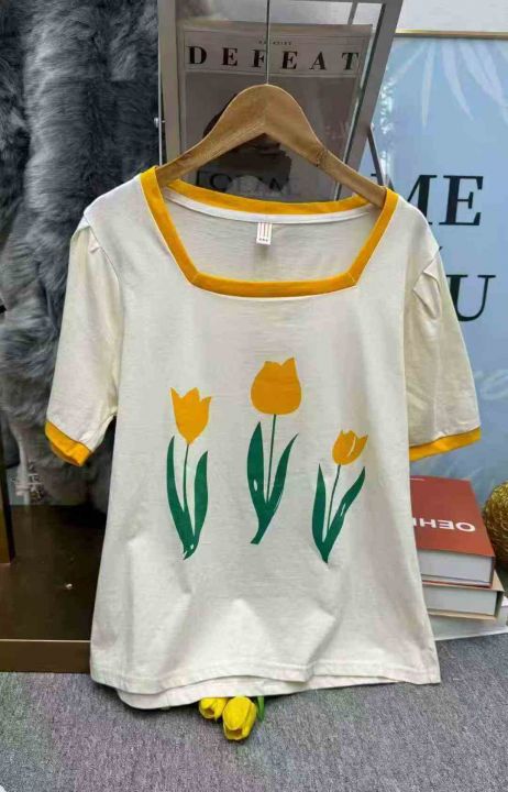 新款别致休闲夏季超火拼接撞色郁金香印花短袖t恤女显瘦短款上衣,独立包装,数量276件,码数1-4(M-2XL),货号1019#45