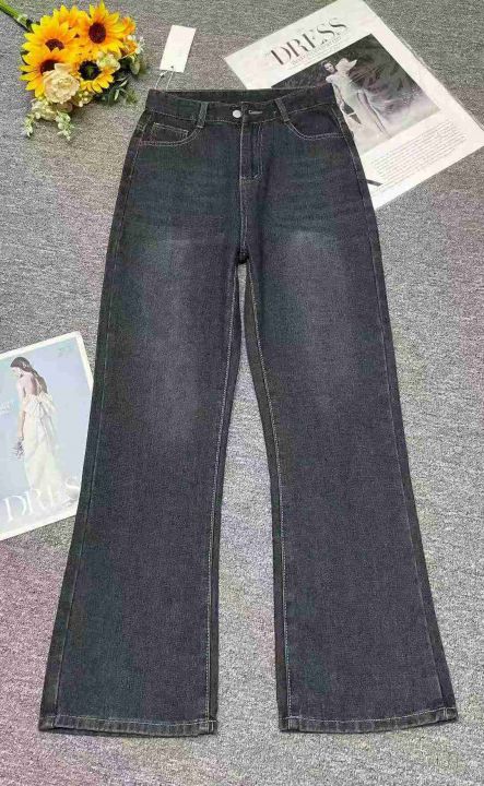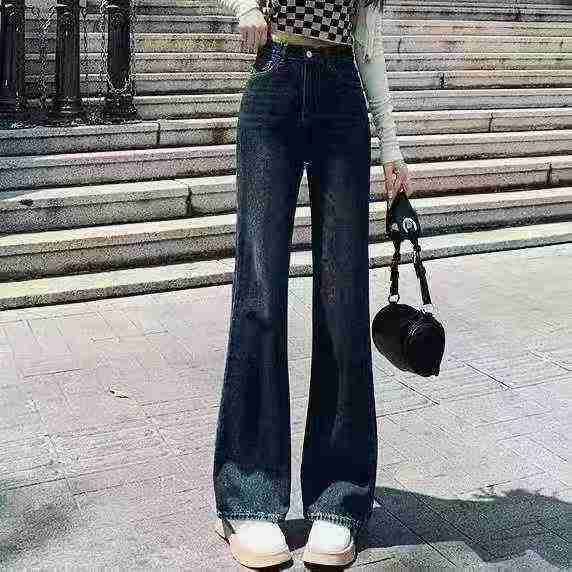 秋冬新款洗水棉网红复古蓝直筒阔腿微喇叭牛仔长裤,独...