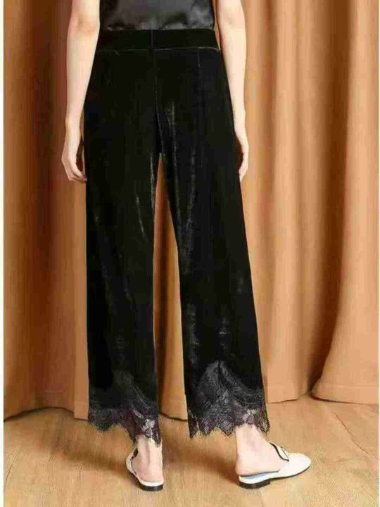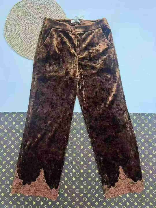 高端金丝绒阔腿花边裤,蔚雯品牌女裤,面料做工都极好,专卖店吊牌价699元,数量200条左右,码数36-40码,咖啡色,独立包装吊牌,模特图供参考,注:实物是咖啡色,没有黑色