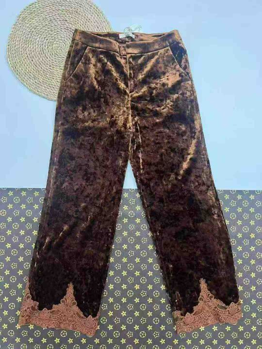 高端金丝绒阔腿花边裤,蔚雯品牌女裤,面料做工都极好,专卖店吊牌价699元,数量200条左右,码数36-40码,咖啡色,独立包装吊牌,模特图供参考,注:实物是咖啡色,没有黑色
