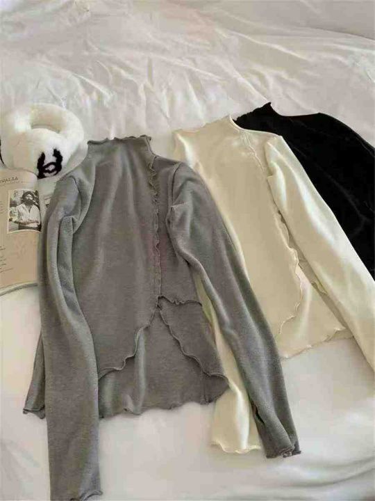 秋冬装螺纹德绒半高领T恤女设计感木耳边修身不规则百...