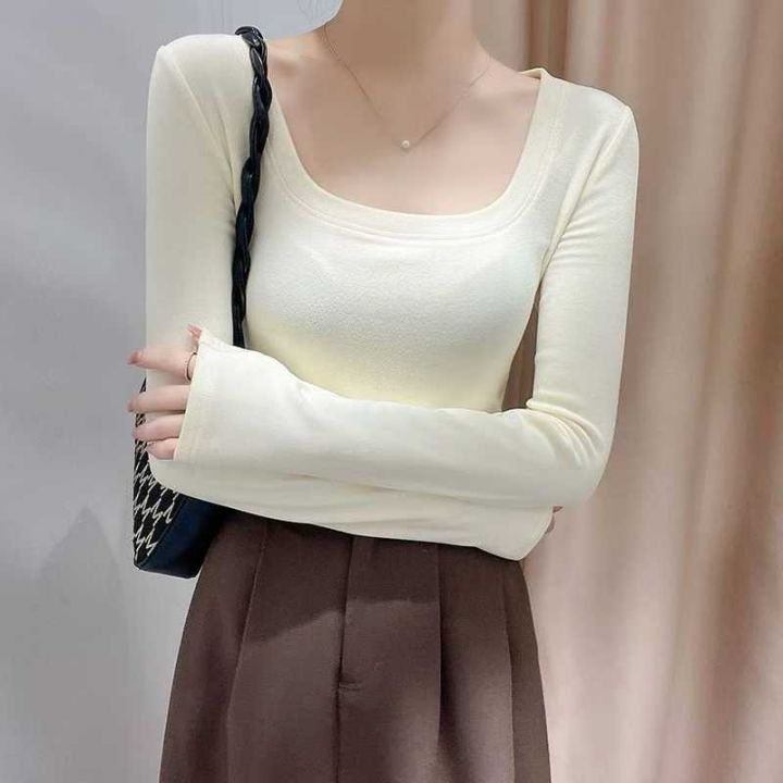 修身纯欲U领纯棉打底衫吊带裙内搭长袖T恤女紧身大领口...