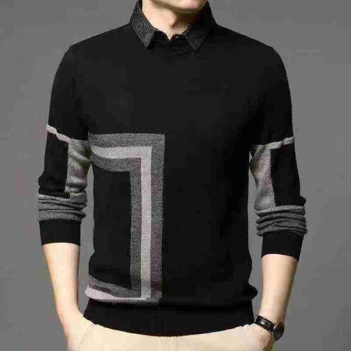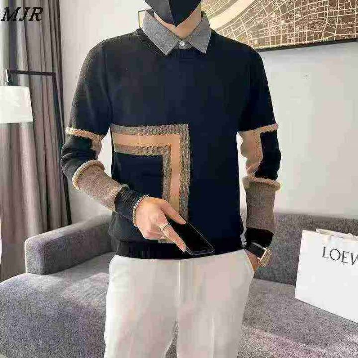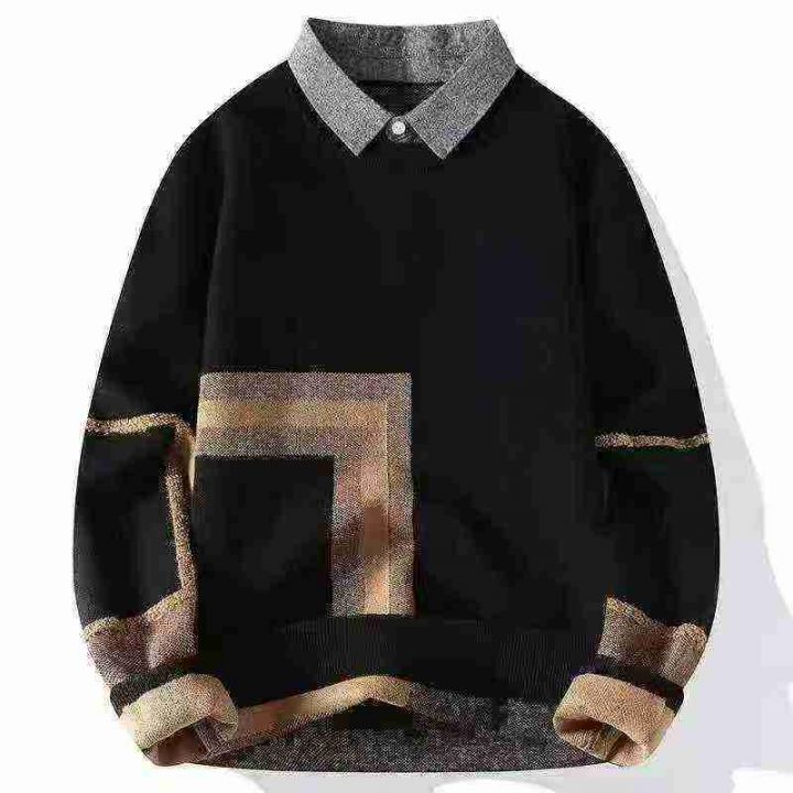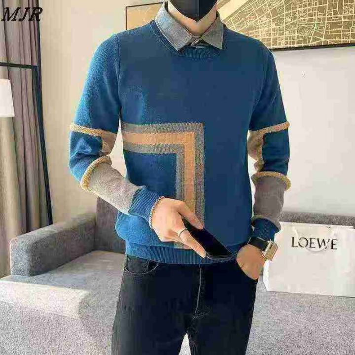 ☕️男装假两件毛衣男士长袖加厚韩版衬衫领拼接针织打...