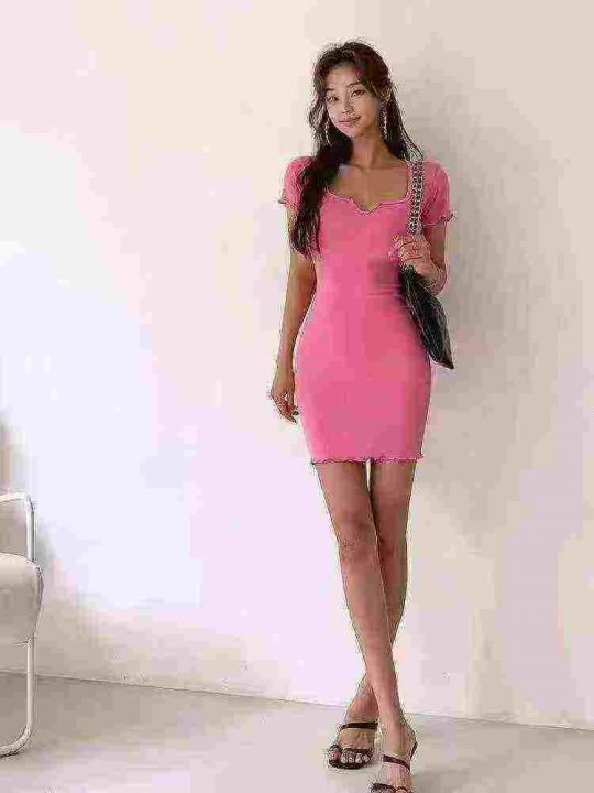 纯欲辣妹玫粉色方领短袖连衣裙修身收腰小个子性感包臀...