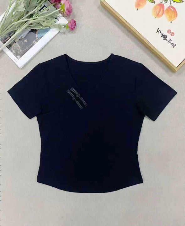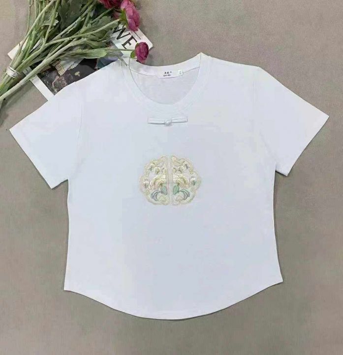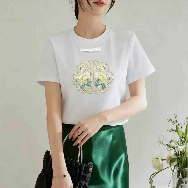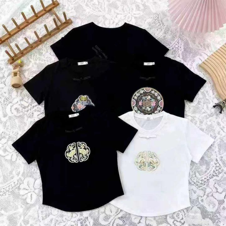 1625件国风重工刺绣中式盘扣拉架棉短袖T恤女,以黑色...