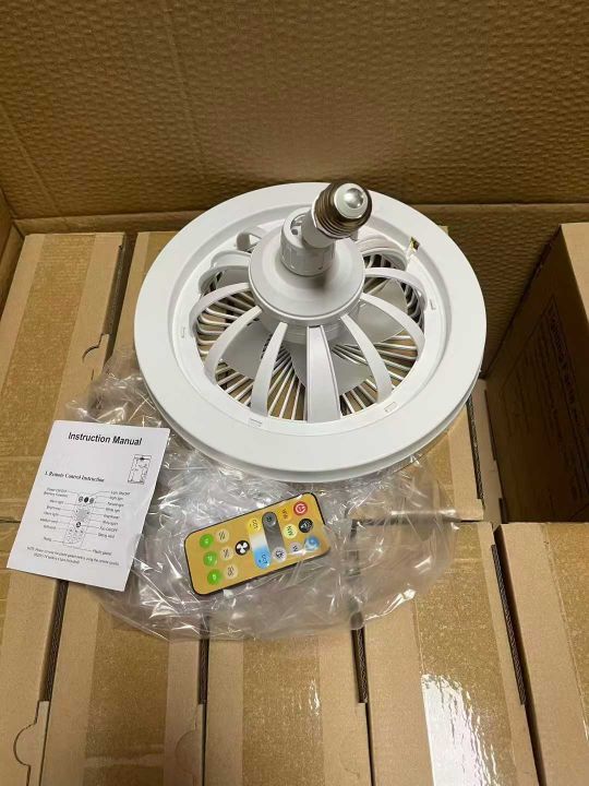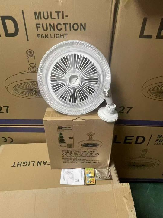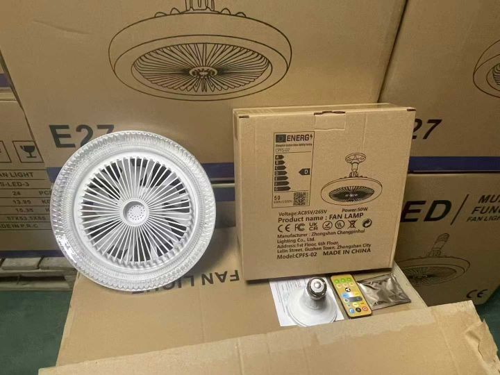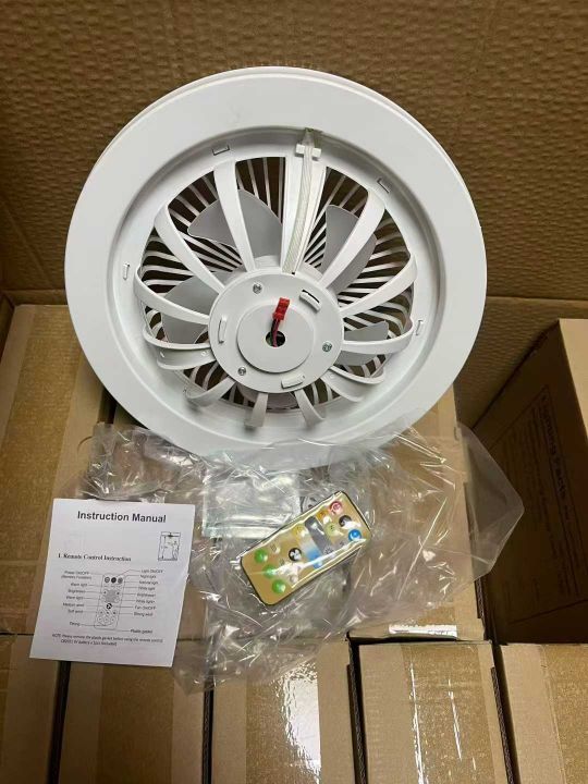 LED多功能风扇灯,E27螺口,带遥控器,三档风力,三色变光,风力大静音,节能省电。全新原包装,配件齐全,说明书、遥控器、E27,数量360台
