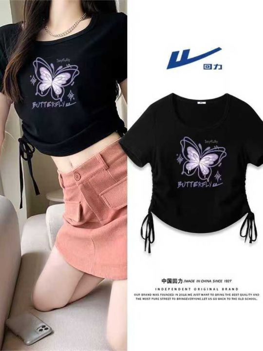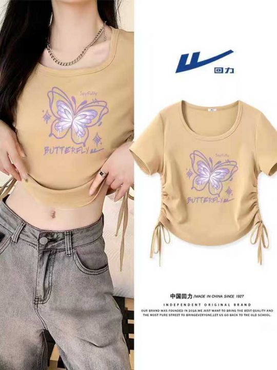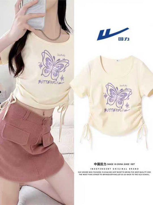 整款辣妹短袖t恤女夏季新款抽绳修身短款夏日多巴胺辣...
