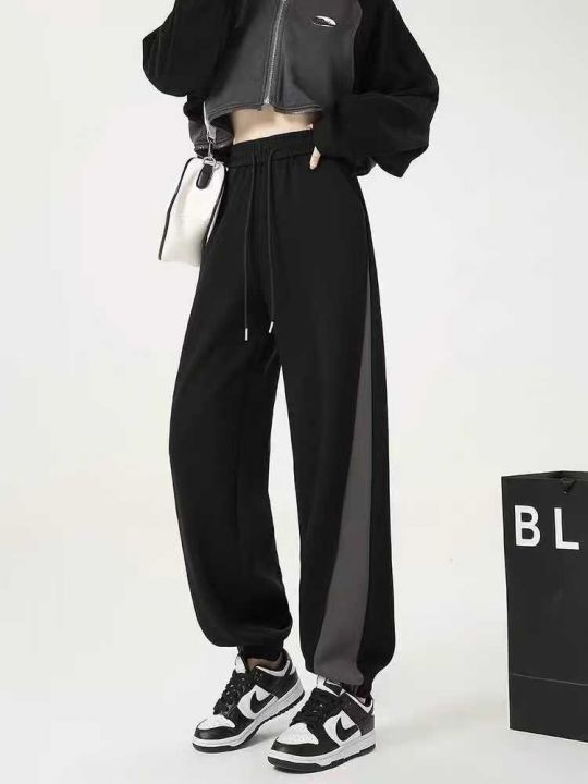 大码美式运动裤女加绒秋冬季宽松显瘦胖mm复古拼接束脚...