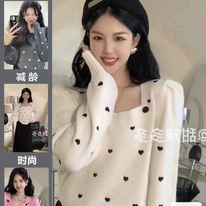 秋冬新款法式气质方领宽松爱心波点提花可爱泡泡袖套头毛衣,独立包装,均码面料柔软舒适弹力大,802件,全清6.9元超低价秒杀!分货加一!